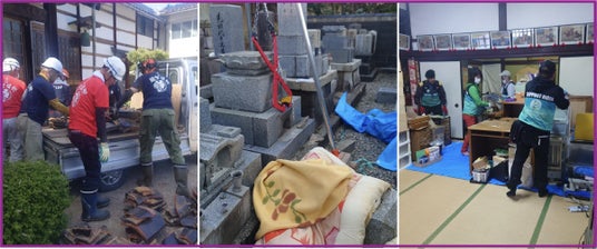 被災後半年以上経過してもまだ倒壊したままの状況であり、多くのボランティアの方々が廃材の回収や片付けを手伝ってくれました。しかし、復興にはまだ長い道のりが待っています。