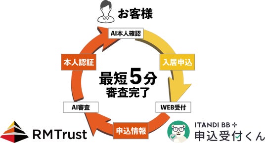 アールエムトラスト株式会社(本社:東京都中央区 代表取締役:松島億 以下「当社」)は、累計40万件の入居申込データを基にしたAI 審査を8月20日(⽕)より開始いたします。申込受付は24時間365日可能であり、申込受付から本人確認、承認回答まで最短5分での対応を実現しました。申込受付には、イタンジ株式会社(以下「イタンジ」)の賃貸住宅の入居申込システム「申込受付くん」と連携します。