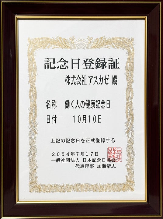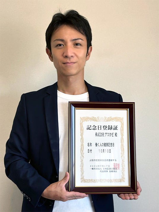 株式会社アスカゼ(本社:宮崎県宮崎市、代表取締役:田中宏樹)は、10月10日を「働く人の健康記念日」として、一般社団法人日本記念日協会(本部:長野県佐久市、代表理事:加瀬清志)に登録しました。この記念日は働く人々の心身の健康をサポートし、ワークライフバランスを整えるための啓発活動を推進することを目的としています。
