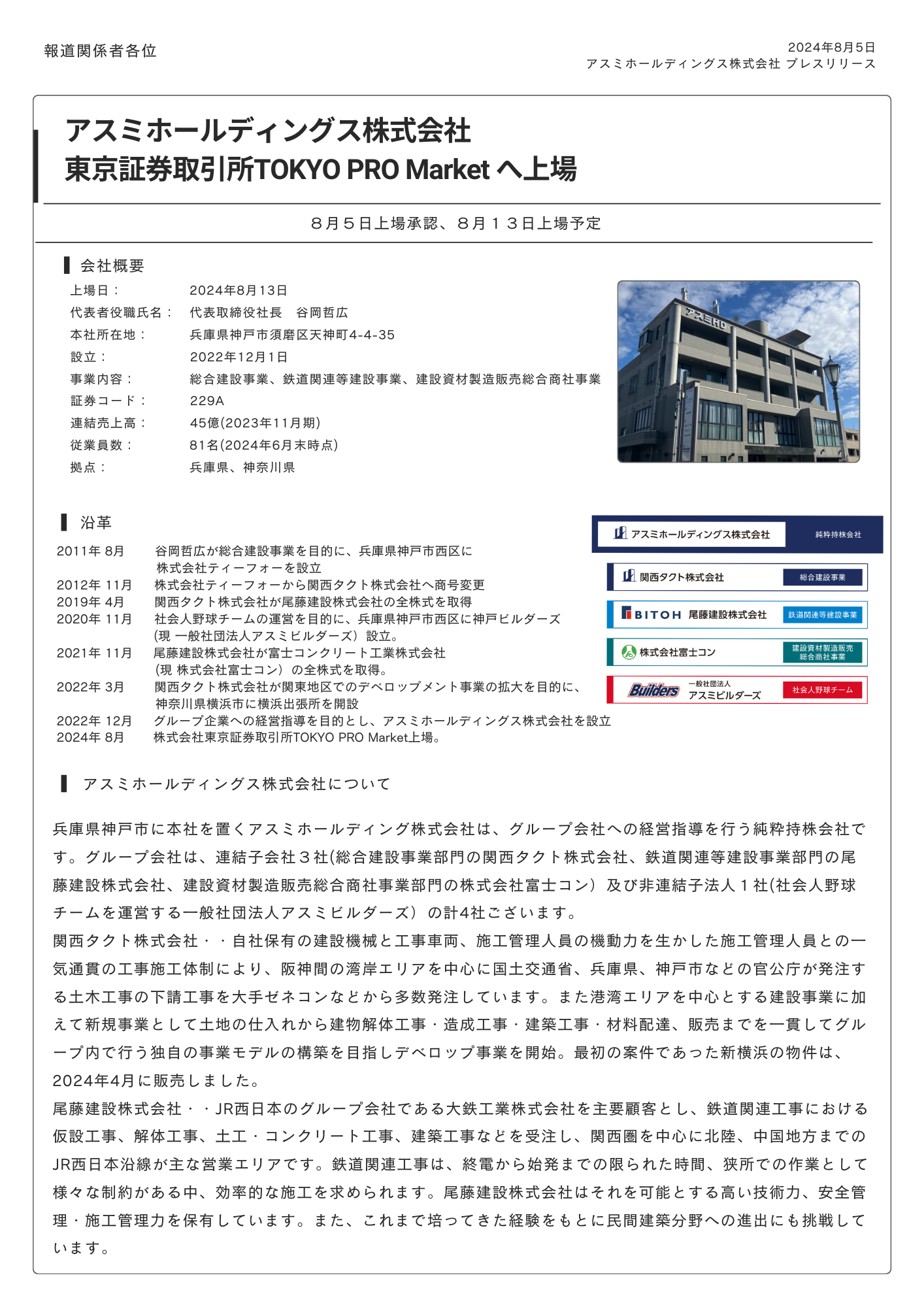 2024-08-05 アスミホールディングス株式会社 アスミホールディングス株式会社 東京証券取引所TOKYO PRO Marketへ上場 Tweet 8月5日上場承認、8月13日上場予定 【本件に関するお問い合わせ】 アスミホールディングス株式会社 TEL:078-785-1100 MAIL:kikaku@k-takt.co.jp 企業プレスリリース詳細へ PR TIMESトップへ 公式ツイッター Follow @Straightpress 最新情報をTwitterで受け取ろう! 公式フェイスブックページ 最新情報をFacebookで受け取ろう! 前の記事 一覧へ戻る 次の記事