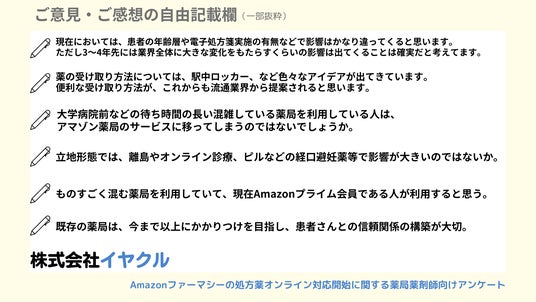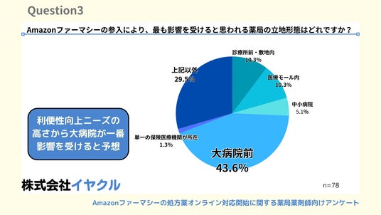 株式会社イヤクル(本社:北海道、代表取締役:佐孝尚)は、Amazonファーマシーとウェルシアホールディングスなど大手ドラッグストアの業務提携が薬剤師の間で大きな反響を呼んでいることから、医薬品ロス解消プラットフォーム「イヤクル」ユーザーとX(旧Twitter)の薬剤師を対象に「Amazonファーマシーの処方薬オンライン対応開始に関する意識調査」を実施しました。本調査は、2024年7月30日から8月5日にかけて行われ、78名の薬剤師から回答を得ました。