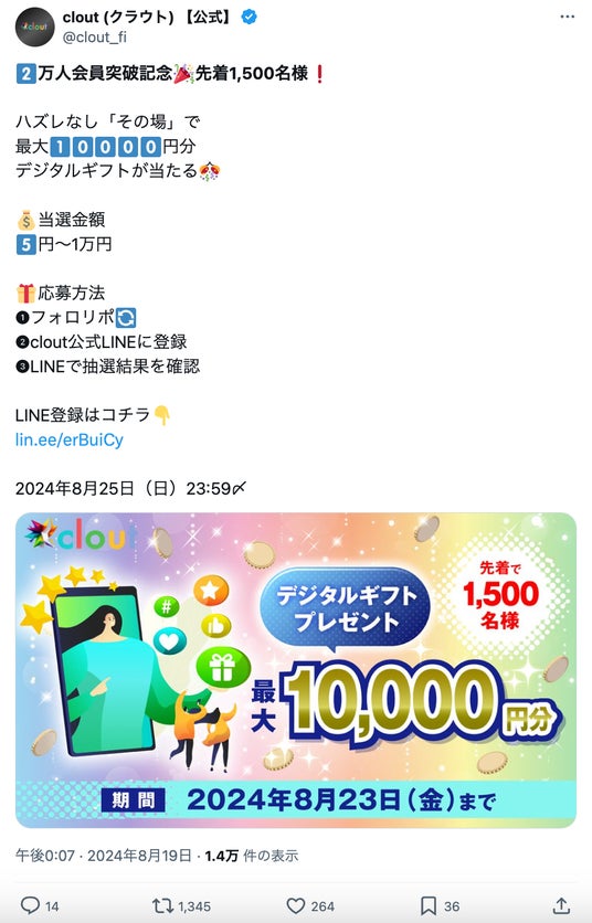 2024年4月16日にSNSキャンペーンツール「clout」のベータ版リリース後Xのフォロワー3万人、会員登録が2万人を超えたことをお知らせします。
