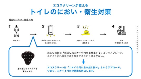 トイレが臭くなる原因は意外と正しく理解されていません。実は体から排泄された尿自体は無臭ですが、壁や床に飛びはねた尿が、時間の経過とともに空気中のバクテリアと反応を起こすことで、アンモニア臭を発生させています。つまり、トイレが臭くなる原因は「床や壁に飛びはねた尿」であり、「尿の飛びはねをなくすこと」はトイレのニオイ対策に劇的な効果が期待できます。また、トイレが汚れる最大の原因も「尿の飛びはね・たれ」であることは明らかです。エコスクリーンは「尿の飛びはね防止技術(シールド・ブリスルテクノロジー)」にて日本で特許を取得しており、ニオイと汚れの共通の原因に効果的な解決策を提供します。