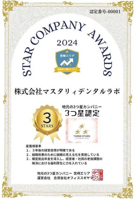 Office SUGIYAMA グループは、2024年10月17日(木)に「宮崎初!3つ星カンパニー認定授賞式」を開催しました。この式典では、受賞企業である株式会社マスタリィデンタルラボ(本社:宮崎県宮崎市、代表 下田昌幸)に認定証が授与されました。下田社長からのご挨拶では3つ星認定への想いや経営理念、従業員への想い等のお話をいただきました。参加者からは和やかな反応が寄せられ、地域の未来志向の企業に対する期待感がより高まる授賞式となりました。