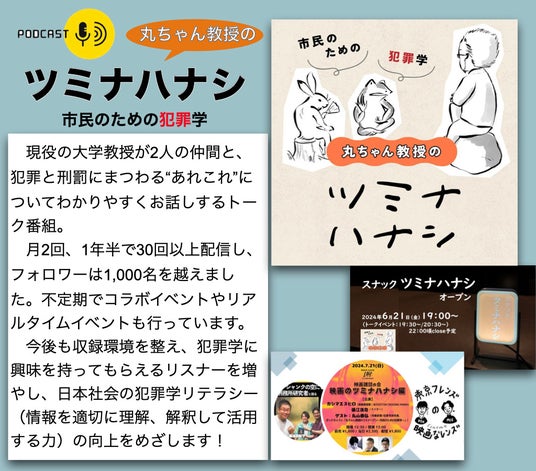 メタバース模擬裁判に加え、犯罪と刑罰についての情報をわかりやすく提供するPodcast番組“丸ちゃん教授の「ツミナハナシ」”で、リーガル・リテラシー(法に関する情報を適切に理解・解釈して活用する力)の普及と定着をめざします。