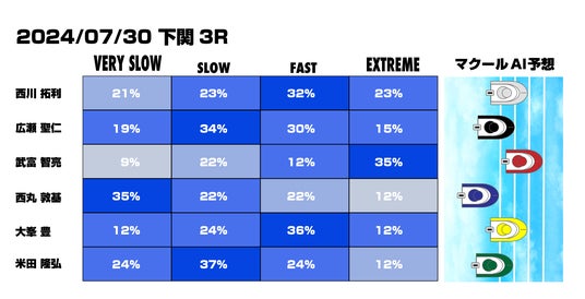 マクールAIスリット(イメージ画像):レースごとに各艇(選手)が、"VERY SLOW"から"EXTREME"までの4段階それぞれでスタートする確率を「%」で表示。その数値を元にスタートタイミングの予測を右側に画像で示しています。