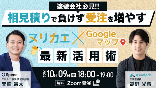 リフォーム業Googleマップ対策(MEO対策)を専門とするAsantech株式会社と、業界TOPレベルのリフォーム・塗装ポータルサイト「ヌリカエ」を運営する株式会社Speeeが初のコラボセミナーを開催します。