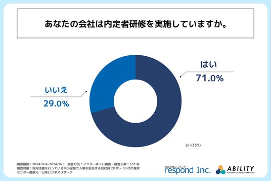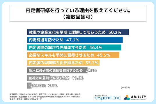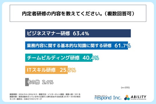 株式会社レスポンド(本社: 東京都千代田区、代表取締役:宮田 寿志)とアビリティ株式会社(本社: 京都府右京区、代表取締役:松村 由紀)は、採用活動を行っている中小企業の人事担当者を対象に「内定者研修」に関する調査を実施しました。この調査結果から、中小企業の内定者研修の実態が明らかになりました。
