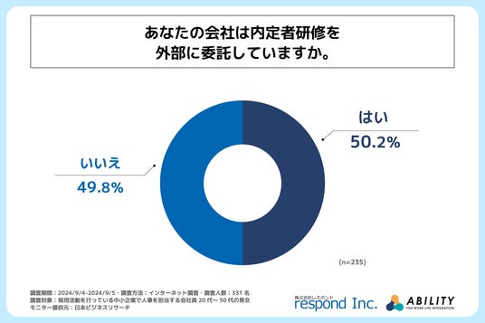 また、内定者研修を実施していると回答された方に「会社は内定者研修を外部に委託しているか」を尋ねる設問の回答では、「はい」が若干多く50.2%という形となりました。ただ、「いいえ」の49.8%とは僅差であり、中小企業で内定者研修を外部委託している会社の割合は約半数であるとわかりました。