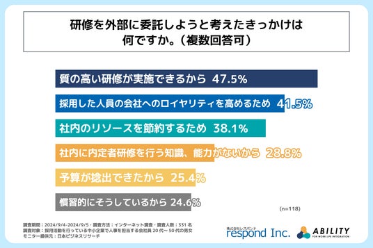 次に、内定者研修を外部に委託していると回答された方に「研修を外部に委託しようと考えたきっかけは何か」を問う設問への回答では、1位が「質の高い研修が実施できるから」で47.5%、2位が「採用した人員の会社へのロイヤリティを高めるため」で41.5%という結果になりました。この結果から費用をかけてでも外部に委託し、内定者時代から質の高い研修を受けてもらう、といったことをしている中小企業が一定数存在すると判明しました。
