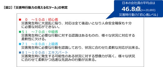 本ツールを用いて、日本の企業で働くビジネスパーソン20,693人の災害時行動力を採点した結果、平均点は100点満点中、46.8点でした。この点数は、取るべき行動のうち半分も書き出すことができなかったことを表しており、災害時行動力を「エキスパート」「上級者」「中級者」「初心者」の4段階に分けた中で、最下位の「初心者」レベルに該当します。「初心者」レベルでは、災害発生時に大混乱に陥り、対応は全て後追いとなり、人命安全確保も必要な対応ができないという判定で、ほとんどの企業・組織では、人命安全確保のために必要な行動力が備わっていない状況です[図2]。