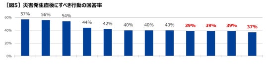 続いて、災害発生直後にすべき行動について、チェックリストにある行動のうち、書き出すことができた行動の割合(回答率)を12項目別に比較すると、「避難誘導」「対応体制の設置」「応急救護の実施」 など人命の安全確保に直結する項目の回答率は39%と4割を下回る結果となりました[図5]。これらの項目は、多くの企業でルール化・マニュアル化されていると思われますが、災害を体験として実感していない中、マニュアル等文章のみの情報を発信するだけでは、社員一人一人に対して浸透しないことが明らかになりました。
