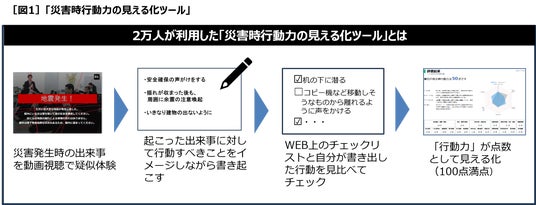 アンドレジリエンスの「災害時行動力の見える化ツール」は、社員が災害時に求められる行動にどれだけ気付いたかを点数化することができる日本初のツールです。受講者は、災害発生時の出来事を、シナリオ動画視聴を通じて仮想的に体験しながら、動画の中で起こった出来事に対して、どのような行動を取るかをイメージしながら具体的に行動すべきことを書き出していきます。シナリオ動画終了後、取るべき行動のチェックリストが表示され、自分が書き出した行動をチェックリストを基に採点すると、「行動力」が100点満点で数値化されるという仕組みです[図1]。