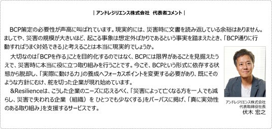 三井不動産グループのアンドレジリエンス株式会社(代表取締役社長:伏木宏之、以下「アンドレジリエンス」)は、企業の災害時の事業継続力強化を支援する会社です。当社は、想定外の事象をシナリオにより体験し、取るべき行動にどこまで気付くかを定量的に評価する「災害時行動力の見える化ツール」の提供を2023年1月より開始し、現在(2024年7月)までに、業界・業種を問わず2万人を超える方が利用されています。およそ1年半にわたる取り組み結果に基づき、この度、現在の企業・組織の災害時の行動力と行動課題を点数化いたしました。その結果、BCP(Business Continuity Plan:事業継続計画)策定の有無で点数に差がなく、平均点は46.8点と、人命安全確保も十分にできないレベルという現状が明らかとなりました。