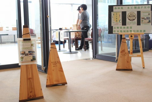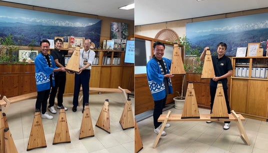 レッドハウスファニチャーと、JAS規格の規格外材を提供された瑞穂木材様から、ウッドパイロン・KOLMIO 10台を長野県庁・林務部へ寄贈。