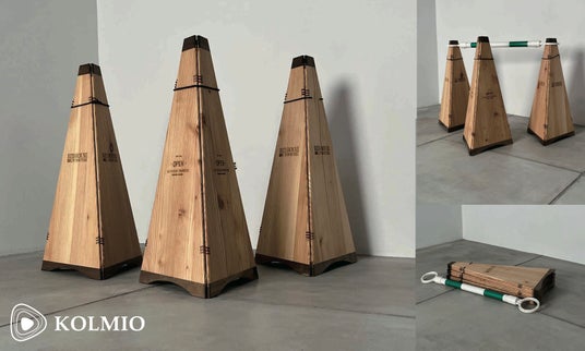 サスティナブルなウッドパイロン・KOLMIO(コルミオ)の発案者であるレッドハウスファニチャー代表の増田氏は、町や道路、開発途中の工事現場、学校や病院、様々な公共施設でプラスチック製カラーコーンを目にし、木質化やゼロカーボンを推奨する自治体や企業でも多くのプラスチック製カラーコーンが使用し続けられておることに気付きました。「木製のカラーコーンの開発は環境対策を進める上で、今後は必須アイテムと成る!」と考え、今までにない新規性、機能性、既存のバーが使える互換性を揃えた、折りたたみ式・リバーシブル設計のウッドパイロン・KOLMIO(コルミオ)を生み出しました。「コルミオ」とは、フィンランド語の三角形を意味します。
