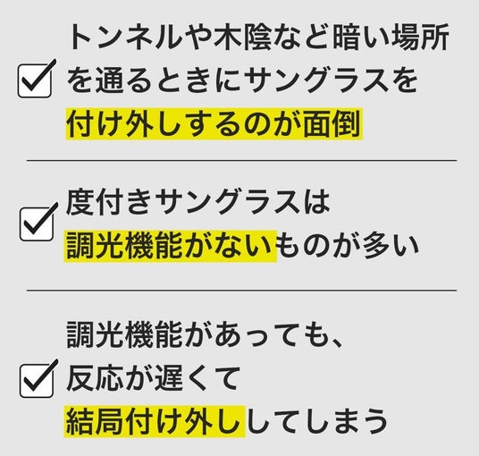 特許取得の瞬間調光技術を搭載した、一度使うとクセになる瞬間調光スマートサングラスが誕生!「眩しい」「暗い」に瞬時に反応して、超快適・安心な視界へあなたをアップデート