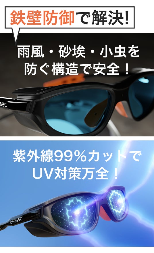 2. UVカットに加えて、IP57防水防塵&ISO認定の耐衝撃性。全方位から眼をガード。