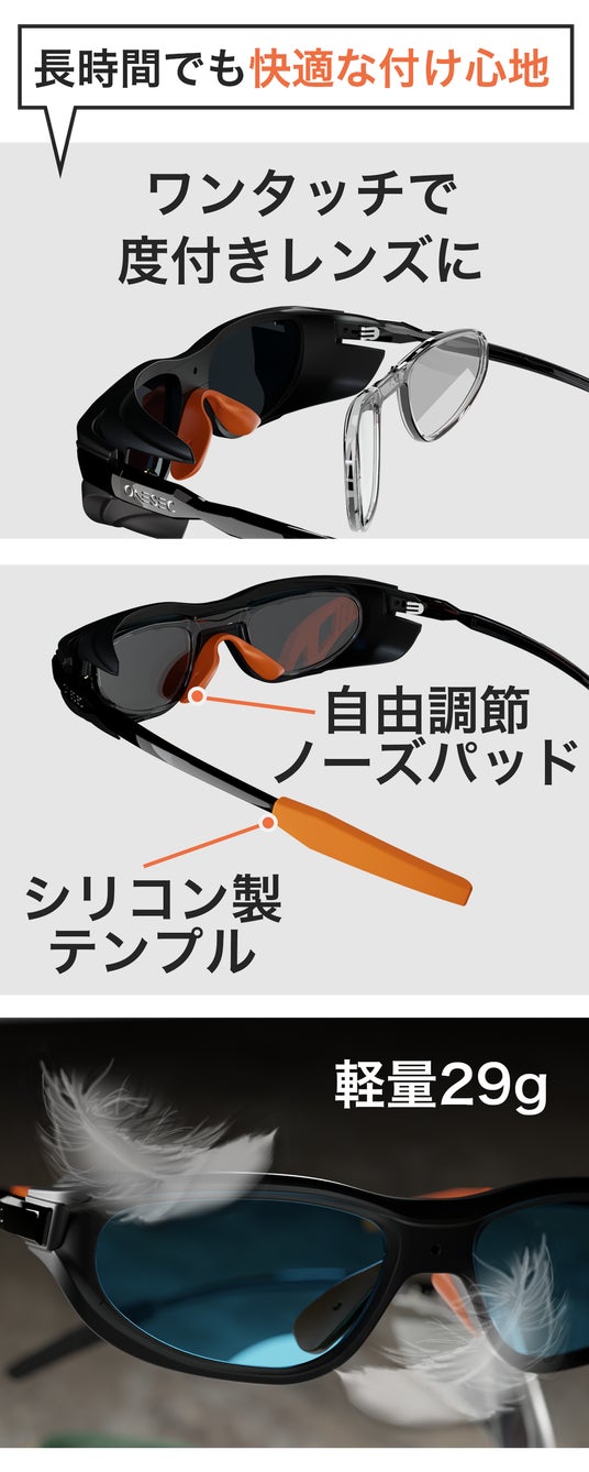 3. わずか29gの超軽量で付け心地も快適。付属のフレームで度付きレンズにも対応。