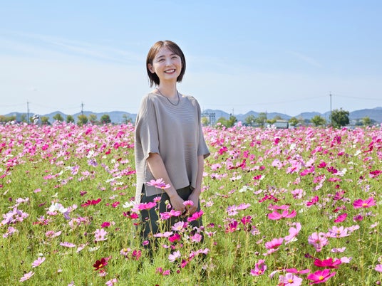 おのののかさんは小野市役所に先立ち、「ひまわりの丘公園」を訪れました。公園では今、色とりどりのコスモスが見頃を迎え始めています。コスモスの数は、なんと関西最大級の約400万本! 花のじゅうたんのように一面に広がるコスモスを間近にして、「わあ、きれい~!」と歓声を上げたおのさん。「こんなにコスモスが咲いている場所って、なかなか無いんじゃないですか?」と感激し、青い秋空を背景に風に揺れるコスモスをうっとりと眺めながら、自身のスマートフォンにも絶景を次々と収めていきます。「娘はお花が大好きなので、一緒に来たら絶対喜ぶと思います。夏はヒマワリもきれいだとのことなので、ぜひまた来てみたいですね」と声を弾ませていました。