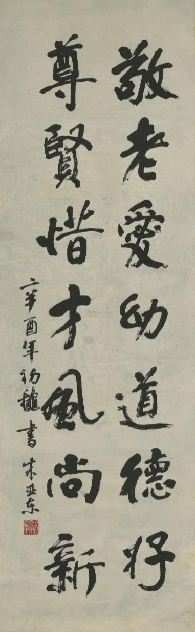 行楷書『敬老愛幼道徳好 尊賢惜才風尚新』(高さ129cm、幅40cm)朱亜東 24歳作