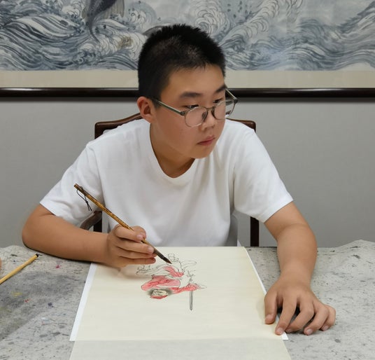 朱闐坤、号は真門。2013年上海で生まれ。上海の著名な書道家・朱亜東の一番上の孫であり、宋代の儒学者・朱熹の末裔。幼い頃から自然に真似て覚えることで、書画に親しみを覚え、特別な愛情を抱き、早くから芸術の才能を示す。1 歳より落書きを始め、4歳の頃、祖父の朱亜東指導の下『芥子園画譜』を模写。書道、絵画、ピアノなど広く渉猟しており、「上海任政杯」の師弟書道展で優秀作品賞を受賞したほか、「童画の星・第17回世界華人幼児創意美術大会」で銀賞、「第14回シンガポール中新国際音楽競技会」のピアノ児童部門で準優勝など20以上のさまざまな栄誉を獲得。2021年には上海で「翰墨丹青・祖孫同楽」と題した朱亜東、朱闐坤両名の書画の小作品展を開催。2023年10月には上海の朶雲軒アートセンターで個展「十歳児朱闐坤国画展」が成功裏に開催され、各界から広く称賛を得た。現在、上海の学校に通う11歳である。