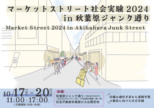 秋葉原タウンマネジメント株式会社(代表取締役 山本俊行)は、日本大学理工学部建築学科都市計画研究室(泉山ゼミ)および一般社団法人ソトノバと協力し、「マーケットストリート社会実験2024 in 秋葉原ジャンク通り」を10月17日(木)~10月20日(日)の期間に実施します。秋葉原地区(東京都千代田区)における秋葉原版ウォーカブルなまちづくりに向けて、秋葉原ジャンク通りに交通規制を行い、滞留空間およびワークショップの創出、秋葉原版ウォーカブルビジョン案の展示や屋外ワークショップを実施します。これに伴い、公共空間の可能性を検証する調査を実施します。