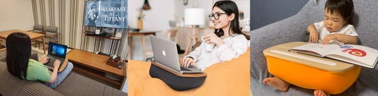 「ラップトップテーブル」は、木工天板とクッション素材を組み合わせた新感覚の持ち運び用デスクです。「ラップトップテーブル」は下半分がクッション素材になっており、その上に天板がついているため、あらゆる場所に置いて使うことができます。そのため、机に向かうのではなく、机を移動させるという新しいスタイルで、様々な作業を行うことができます。