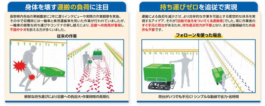 果樹農家の深刻な高齢化や人手不足を解決すべく「作業効率2倍」・「身体的負荷の解消」を目指し、徹底した現場観察から効率的な作業体系を発想、それを実現する「実効的なスマート農機」としてフォローンが生まれました。
