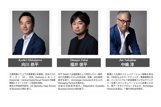 このたび、創業パートナーである福井・中嶋に加え、向川恭平が3号ファンドより新たにジェネラルパートナーとして参画いたしました。福井・中嶋は、起業家としての知見と経験、大企業とのネットワークを活かし、創業から10年以上にわたりArchetype Venturesの投資支援スタイルを築いてきました。これに、総合商社や日米VCファンドでの実務経験を持ち、グローバルな視点でB2B領域への投資に精通する向川の強みを融合させ、新たな体制でさらなる進化を目指してまいります。