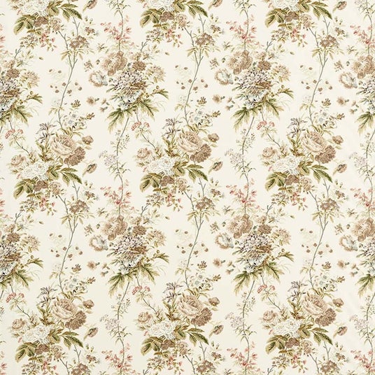サンダーソンの20世紀初頭アーカイブの木版から生まれたクラシックなフローラルデザイン。バラ、アイリス、カーネーション、ポピー、シクラメン、パンジーなど、様々な花が豊かに描かれています。