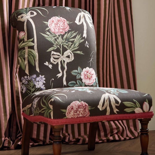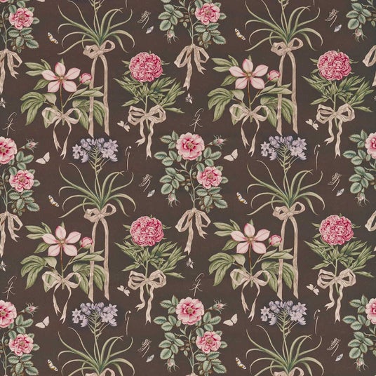 サンダーソンで人気のデザイン「Etchings & Roses」を、ジャイルズのボタニカルイラストスタイルで現代的に。ジャイルズらしいリボンや彼のサインである「G」のカリグラフィーとともに小さな昆虫をちりばめたエレガントなデザインです。