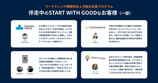 想いや事業コンセプトはとても魅力的で、周囲のステークホルダーからも共感されるにも関わらず、十分な売上に転換できていなかったり、成長スピードが遅いSTART WITH GOODな企業にとって最も必要なのは経営の一丁目一番地であるマーケティング力だと確信しています。私達のマーケティング戦略伴走&内製化支援プログラムによって、その壁を一緒に突破します。結果、多様なソーシャルインパクトがたくさん生まれると信じ、これからも日々研鑽を積みながら活動してまいります。