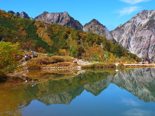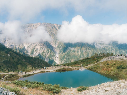標高2,060mの八方尾根の中腹に位置する八方池は、雪解け水や雨水によってできた池です。晴れた日には目前に広がる白馬三山を水面に映し出すため、“天空の鏡”とも呼ばれています。その標高の高さから秋には麓よりも一ヶ月早い10月上旬から紅葉を眺めることができ、赤や黄色に染まったカラフルな紅葉をお楽しみいただけます。