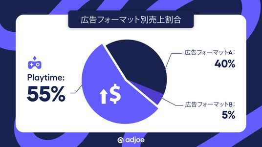 また広告フォーマットにおける収益シェアの割合は、Playtime:55%、広告フォーマットA:40%、広告フォーマットB:5%で、当社のPlaytimeがトップを誇っています。