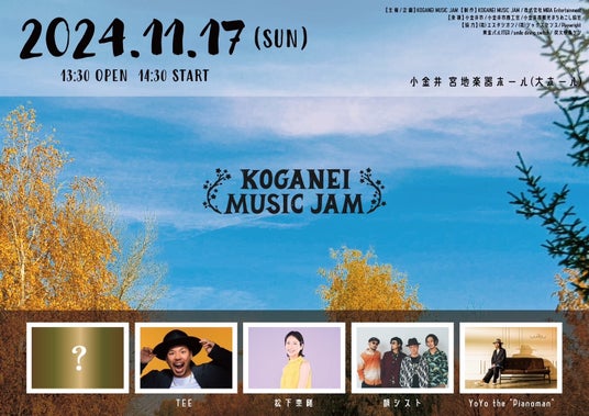 KOGANEI MUSIC JAM(所在地:東京都小金井市 / 主催・代表:天童 裕)は、東京・小金井の音楽フェス「KOGANEI MUSIC JAM 2024」を2024年11月17日(日)小金井 宮地楽器ホール(大ホール)にて開催することが決定しました。