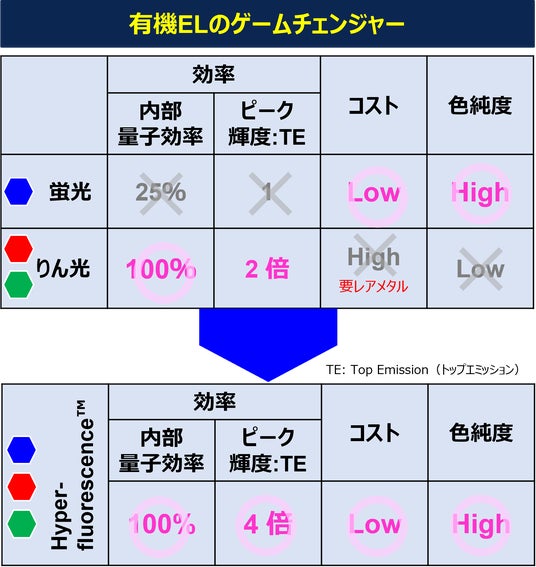 ※³ Hyperfluorescence(TM):TADFを蛍光発光材料と組み合わせることで、TADFから蛍光分子にエネルギーを移動させて発光させる第4世代有機EL発光技術。高効率、長寿命およびレアメタルフリーで高色純度の発光を実現できる究極の発光メカニズム。