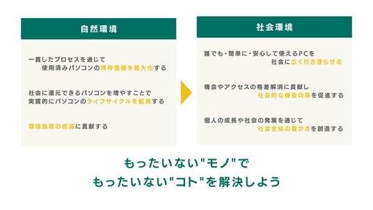 パソコンの多くはソフトウェアのサポート終了やパフォーマンス低下などの理由で廃棄されますが、その中には用途によって十分に継続使用が可能な状態のパソコンも少なくありません。まだ使用できる状態であるにも関わらず廃棄されてしまう"モノ"を、私たちは非常に「もったいない」と感じています。