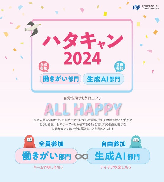 株式会社日本ビジネスデータープロセシングセンター(本社:神戸市中央区、代表取締役社長:池惠二、従業員数:4,556名、以下当社)は、全社が一丸となるキャンペーン「ハタキャン2024」を今年も開催し、2024年9月28日(土)に入賞者の発表と最優秀賞の表彰式を執り行いました。