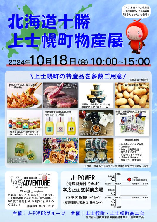 上士幌町商工会(北海道上士幌町、会長:小寺友之)は、2024年10月18日(金) 10時~15時に、電源開発株式会社(J-POWER)本店正面玄関前広場において、地元の特産品を集めた物産展を開催します。