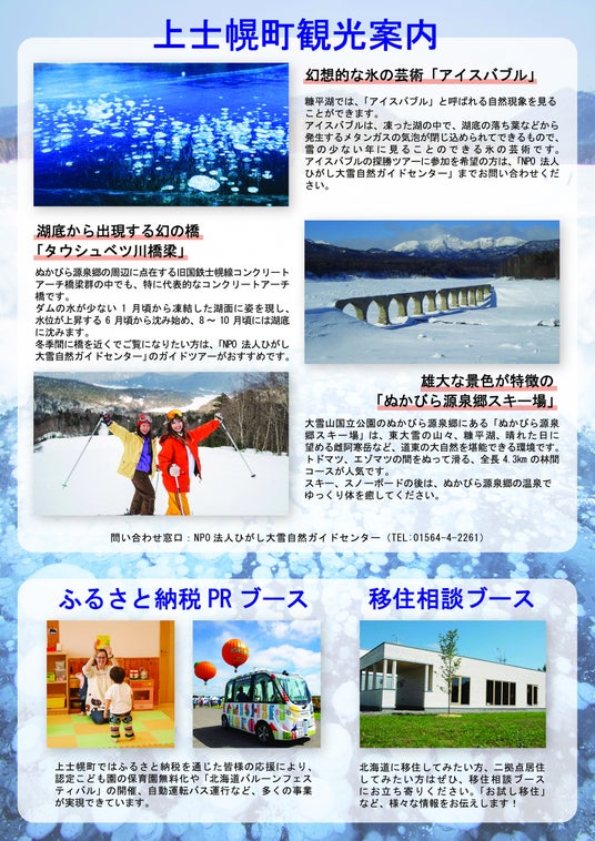 当日は、上士幌町の観光名所を熱気球「ほろんちゃん号」で巡るVR体験コーナーや、北海道への移住や二拠点居住などに関する相談ブースも設けております。