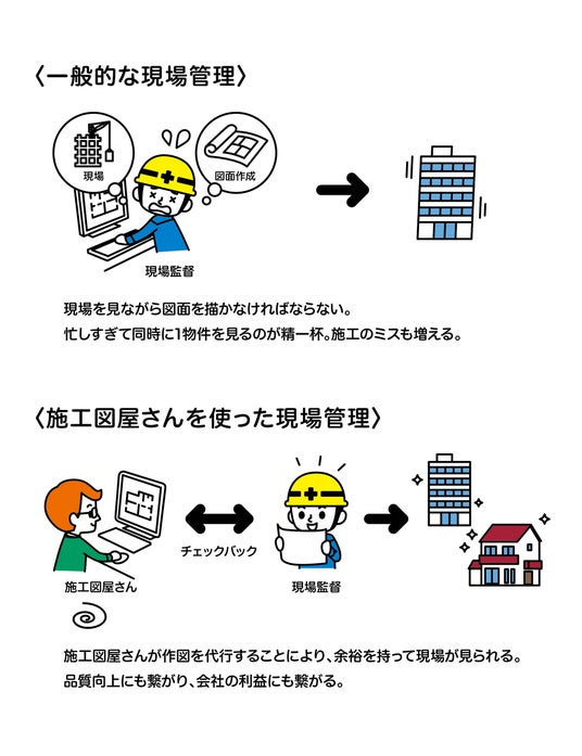 施工図屋さん合同会社は、建築現場で必要不可欠な施工図を高品質・短納期・低コストで代行するサービスを提供しています。施工図は、設計段階の図面にはない細かい部分の寸法なども記載されており、建物のクオリティに大きく影響する重要な図面です。しかし、現在の建設現場では人材不足が深刻で、他の業務と並行して図面を作成しなければならない状況が続いています。