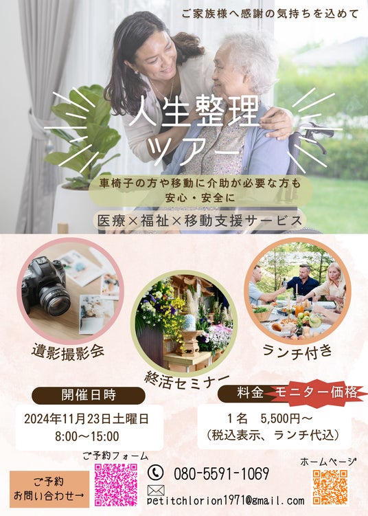 保険外看護サービス ナースプランナー(R)︎ゆいここは、2024年11月23日(土)に、医療×福祉×移動サービスとして、おくりびと(R)︎のお葬式豊平店で人生整理ツアーを開催致します。楽しく終活をテーマとし、終活セミナーをはじめ、納棺の儀のデモンストレーション、メイク付きの遺影撮影会、ランチや特典のご用意もあります。