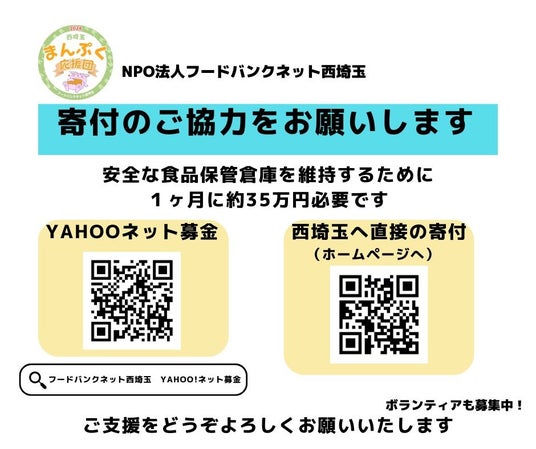 事業収益を上げることのできないフードバンク活動を維持し、一人でも多くの支援を必要とする方を支えるために、食品やお金の寄付を、どうかよろしくお願いします。