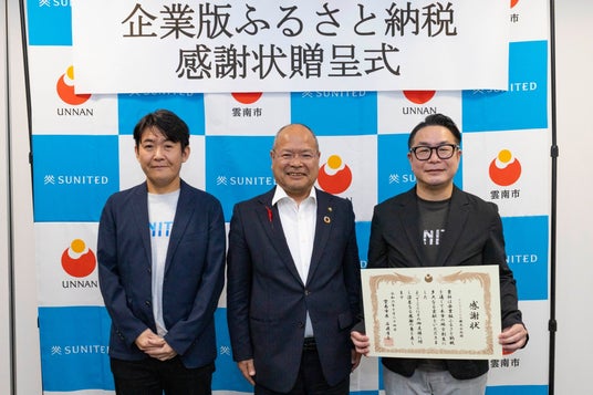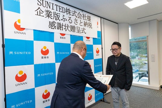 SUNITED株式会社【本社:東京都千代田区 代表取締役:福富啓之】は、2024年10月24日に島根県雲南市から企業版ふるさと納税感謝状をいただきました。この表彰は、雲南市における、企業版ふるさと納税の仕組みを通じた地域社会への貢献が認められ、拝受する運びとなりました。