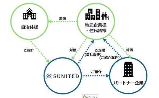 日本の大きな課題である地域活性化をSUNITED独自の伴走型サービスと幅広いパートナーシップで、自治体様と地方企業様を元気にしていきます。地元企業様だけでなく、住民の皆様に対してもサービス提供することで地域活性化を推進しております。