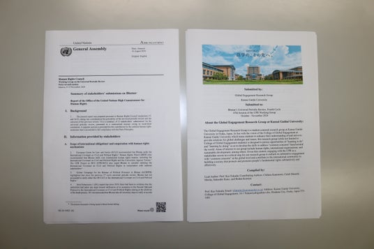 国連人権理事会のサマリー(左)と国際共生学部の5人が提出した報告書(右)