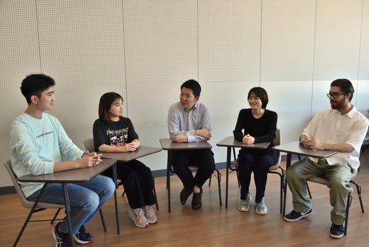 ▲(左から)小宮さん、狩野さん、福田准教授、兼本さん、モリタさん