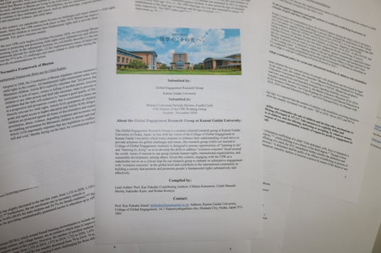 国連人権理事会への報告書をまとめたのは、福田和生准教授と、福田准教授が主宰するインフォーマルゼミ(研究会)に所属する兼本千陽さん▽モリタ・ケイレブ・マサシさん▽狩野桜子さん▽小宮路男さん。11月に国連人権理事会で審査するブータンの人権状況をめぐり、サマリー作成のための資料を報告書にまとめました。