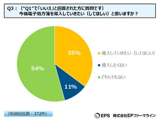 まだ電子処方箋を取り扱っていない薬剤師のうち35%が導入に積極的な回答でしたが、「どちらでもない」は54%、「導入したくない」11%と消極的な回答が65%を占めました。